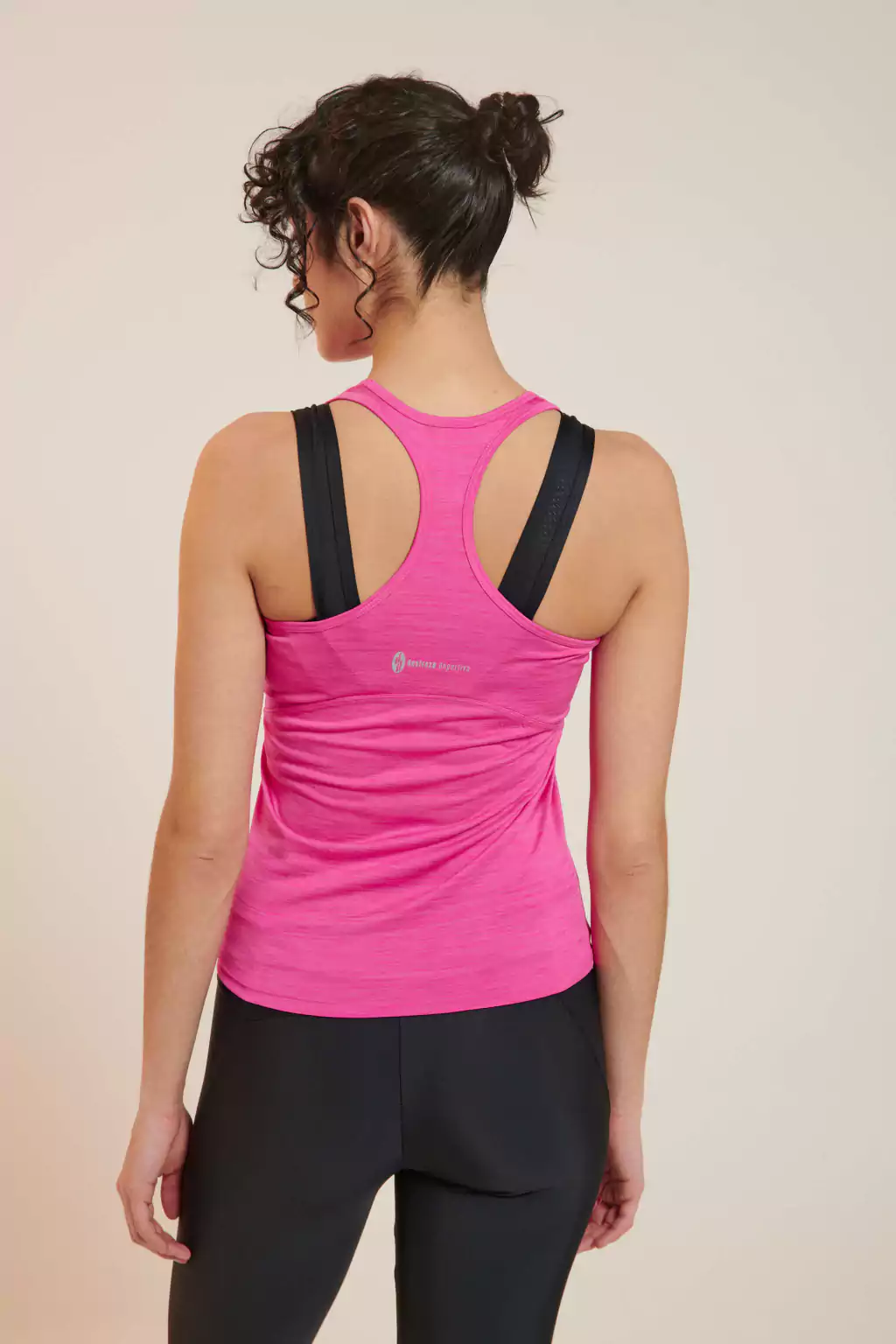 Confeccionada en New Tecno Dry con Interlock con elastano, una combinación que favorece la transpirabilidad, el secado rápido y la elasticidad, manteniéndote fresca durante toda la actividad.